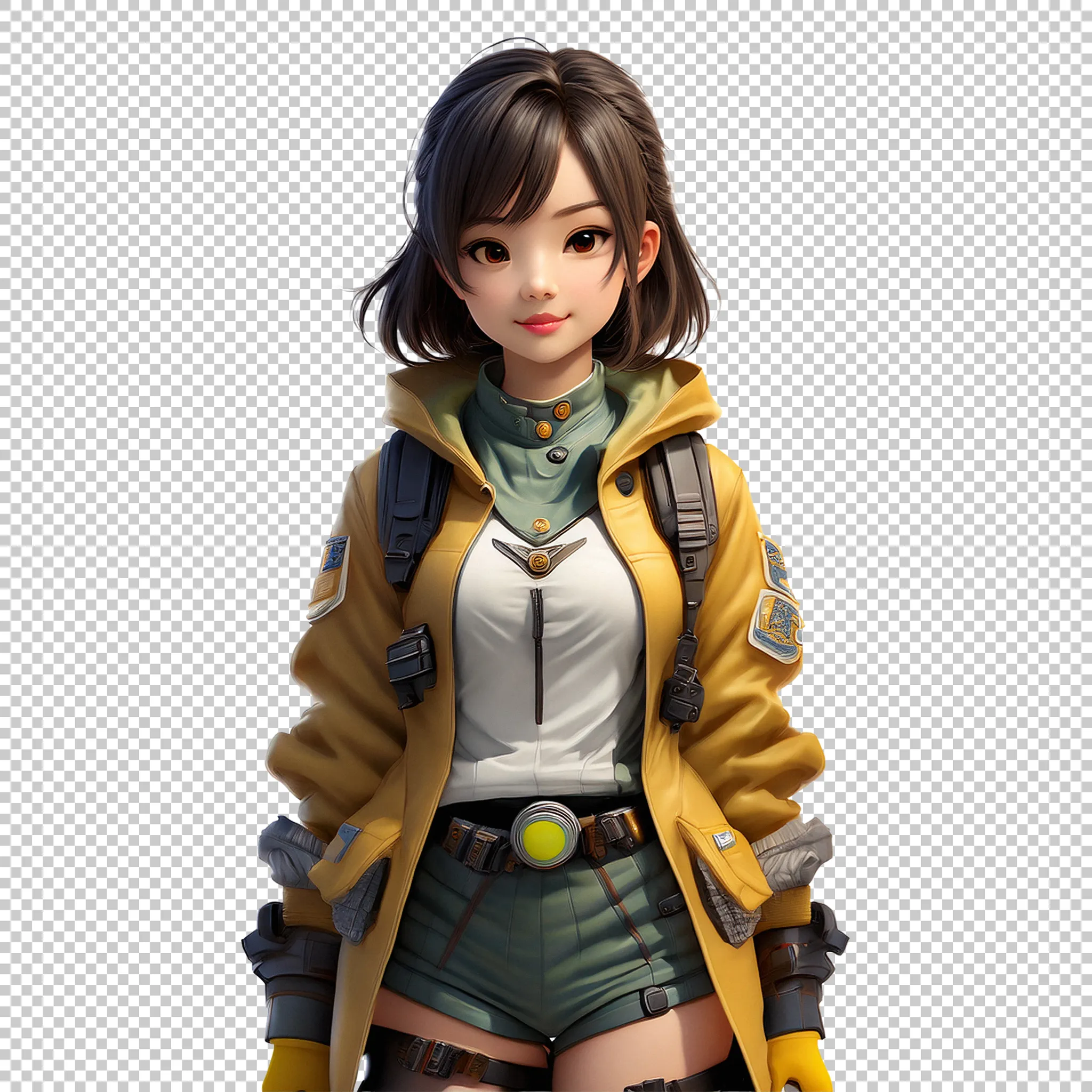 A young asian female teen wearing futuristic Arcane-style clothing standing clipped as a transparent image