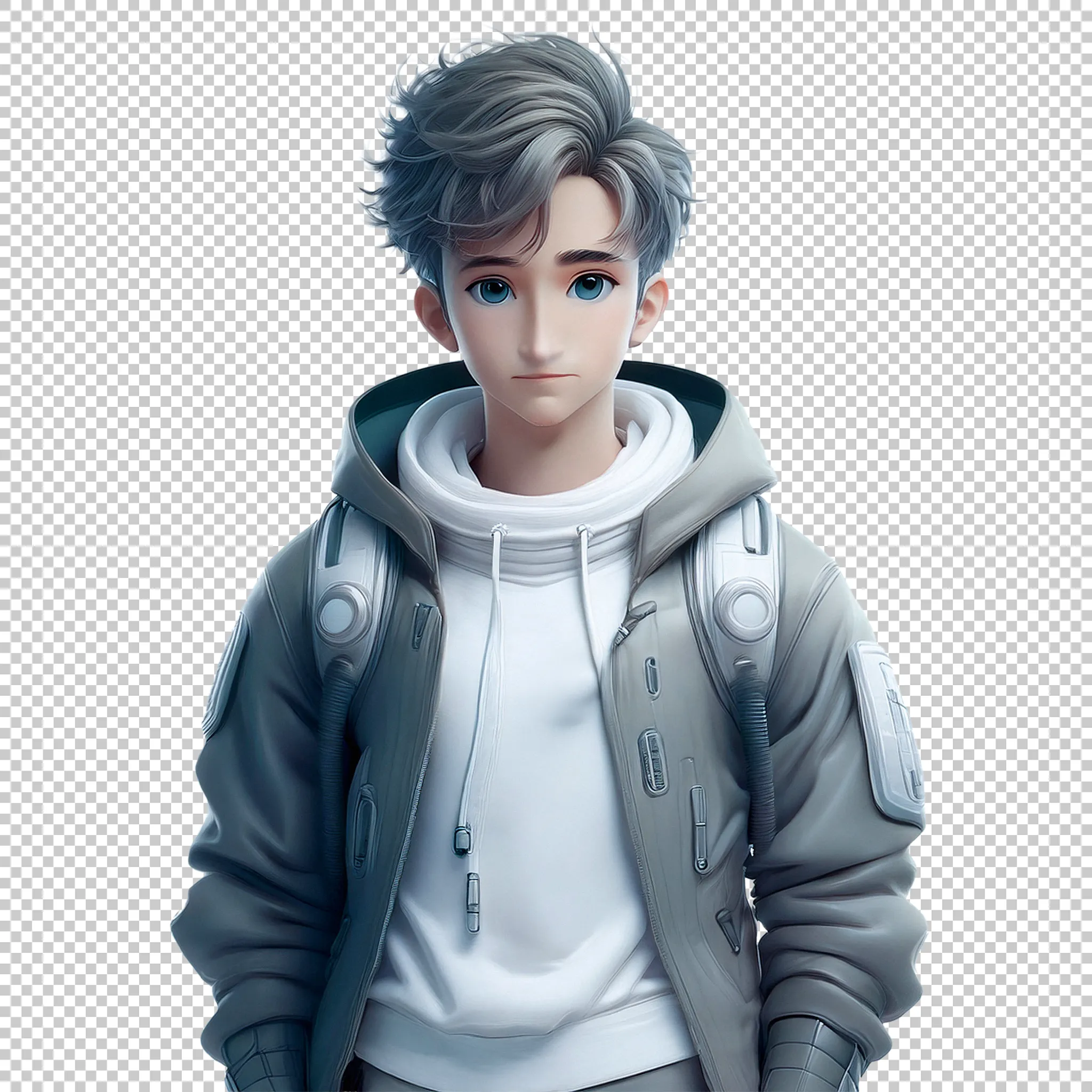 A young teen wearing futuristic Arcane-style clothing standing clipped as a transparent image