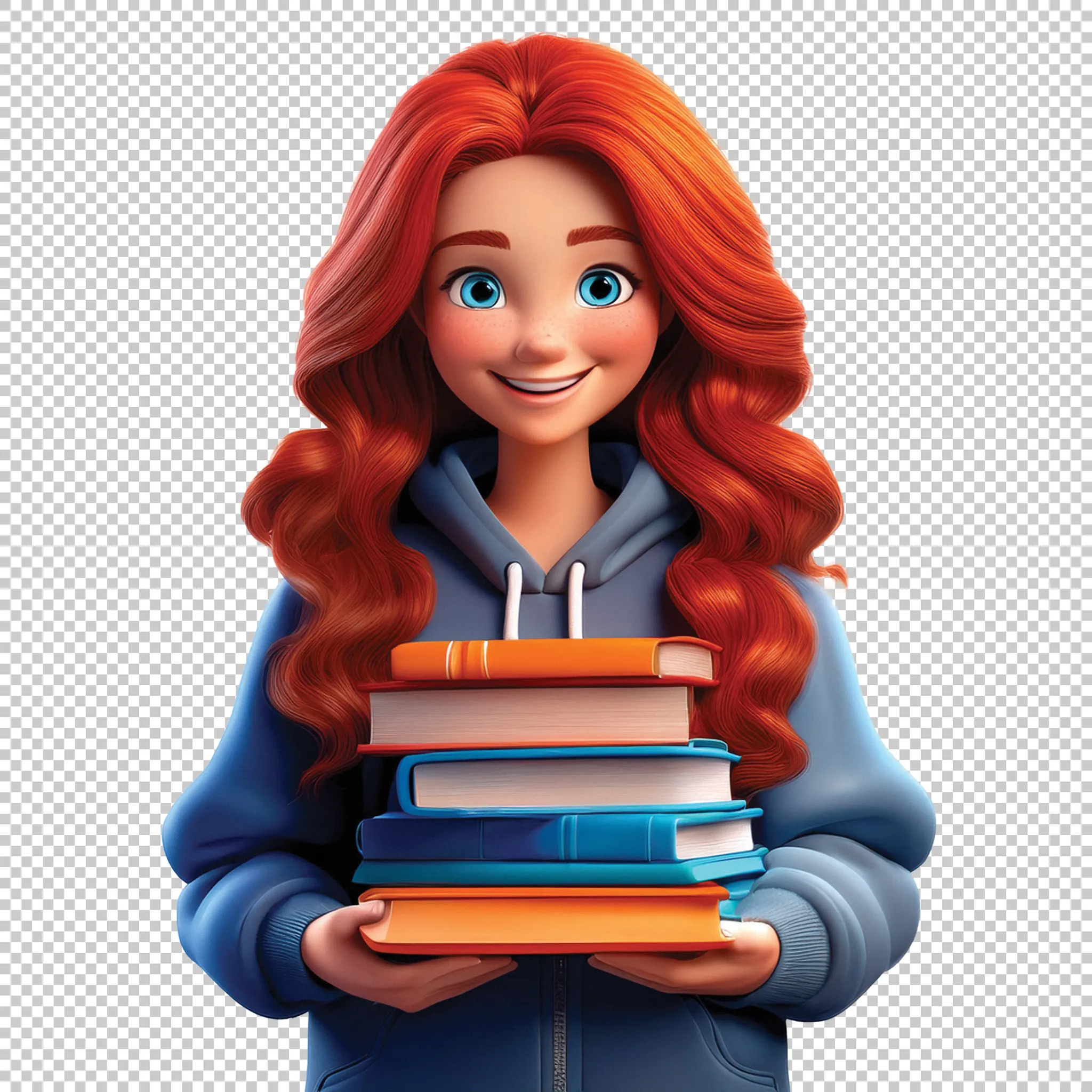 A young girl in a blue hoodie carrying school books clipped as a transparent image