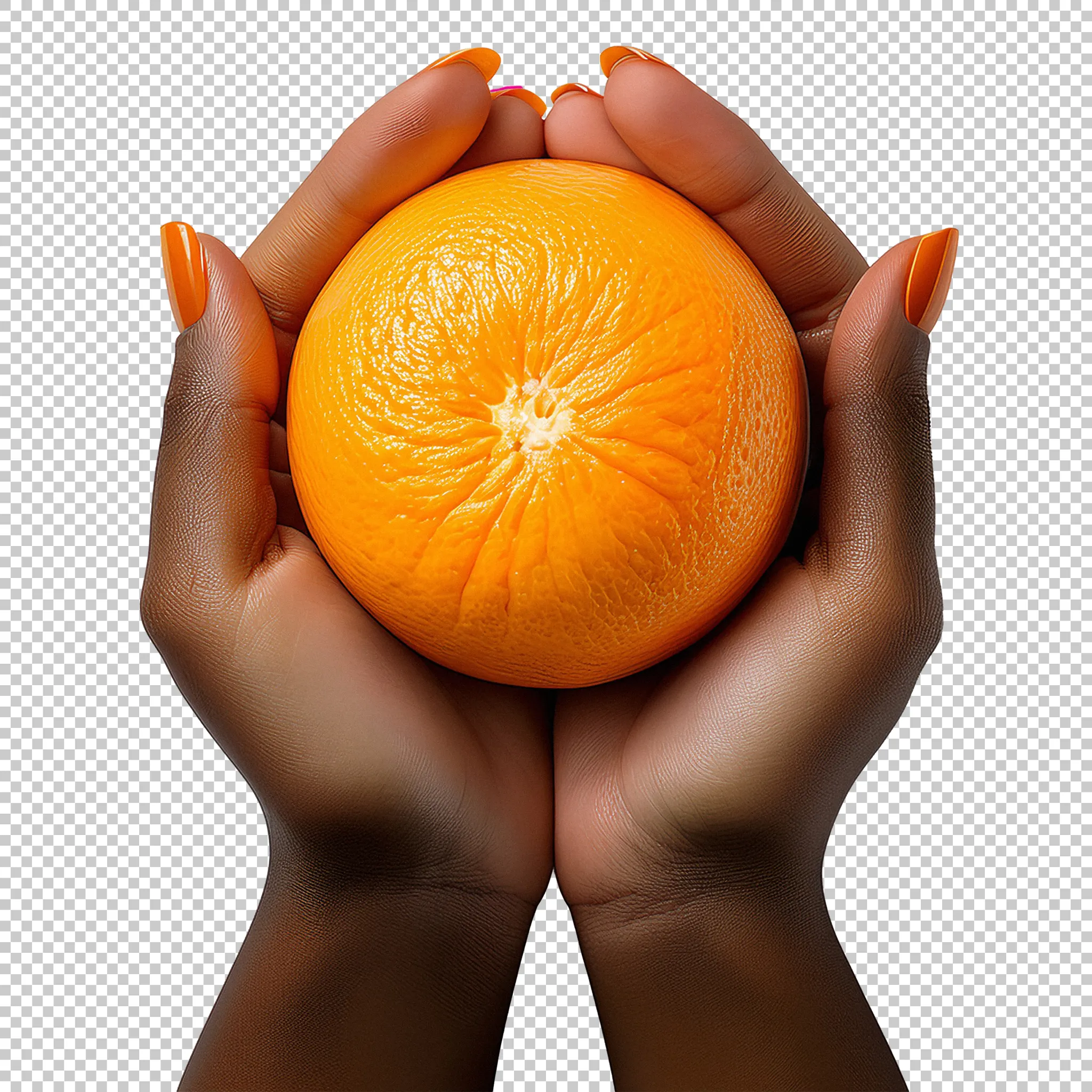 A black woman cupping hands together to hold an orange clipped as a transparent image