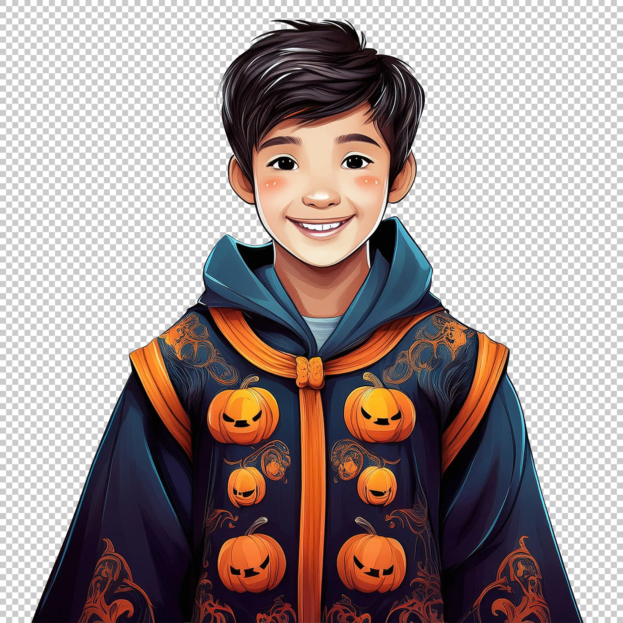 A young asian teen boy in a halloween cloak clipped as a transparent image