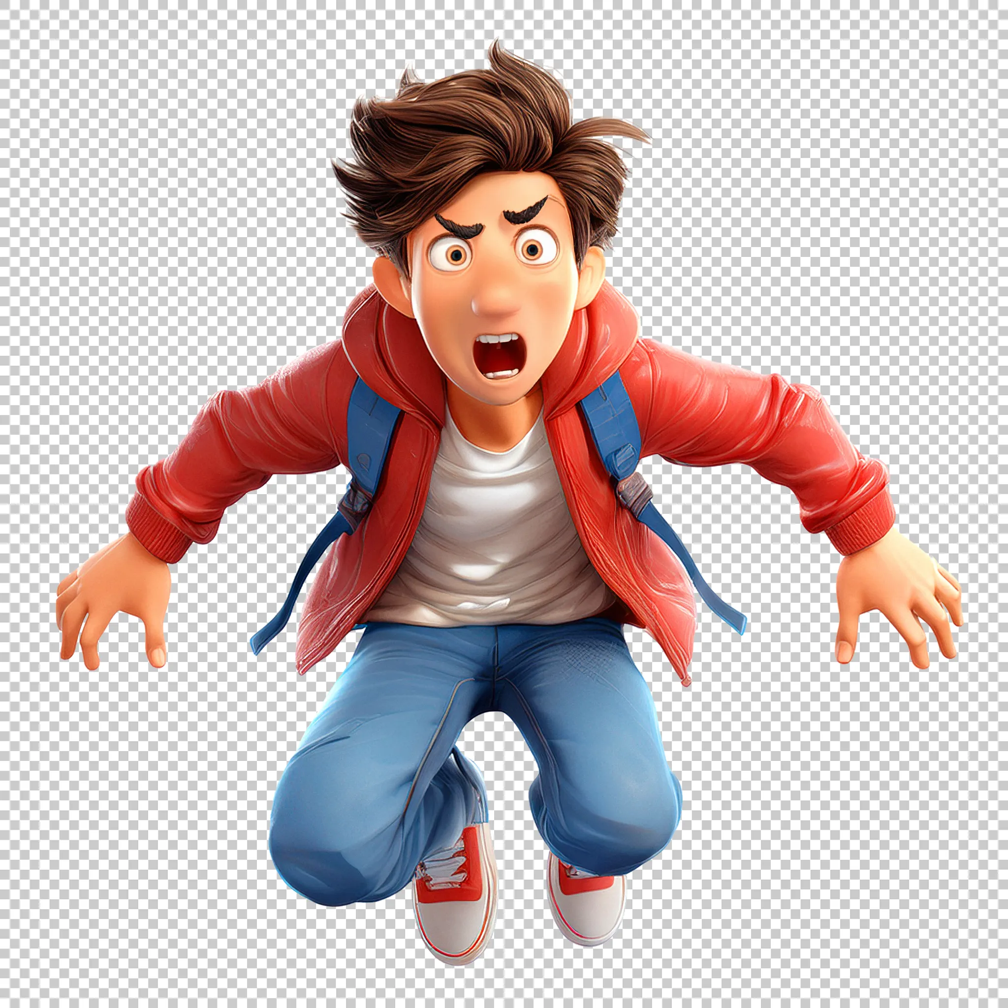 A young angry boy jumping up in the air clipped as a transparent image