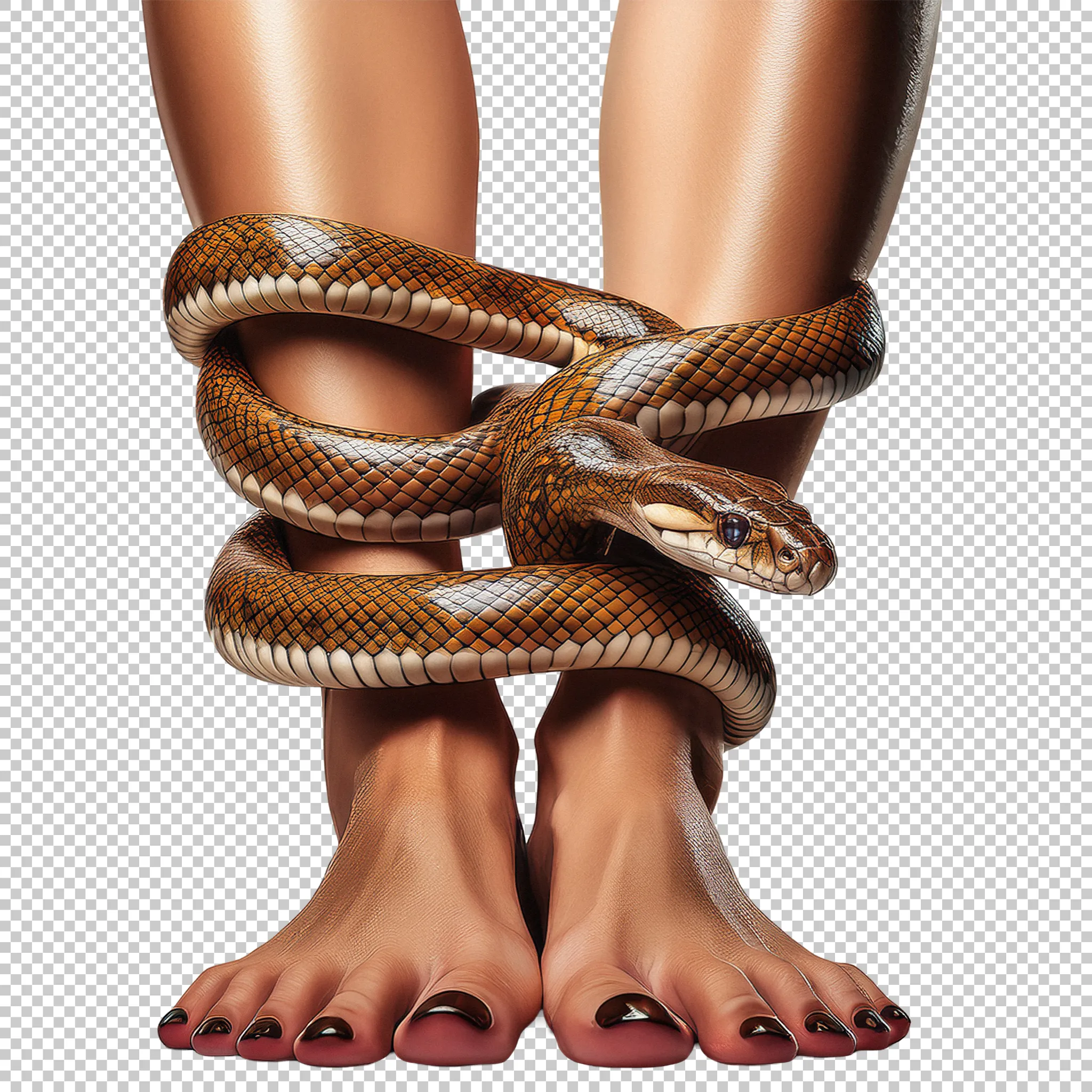 A snake wrapped around a woman’s legs and bare feet clipped as a transparent image