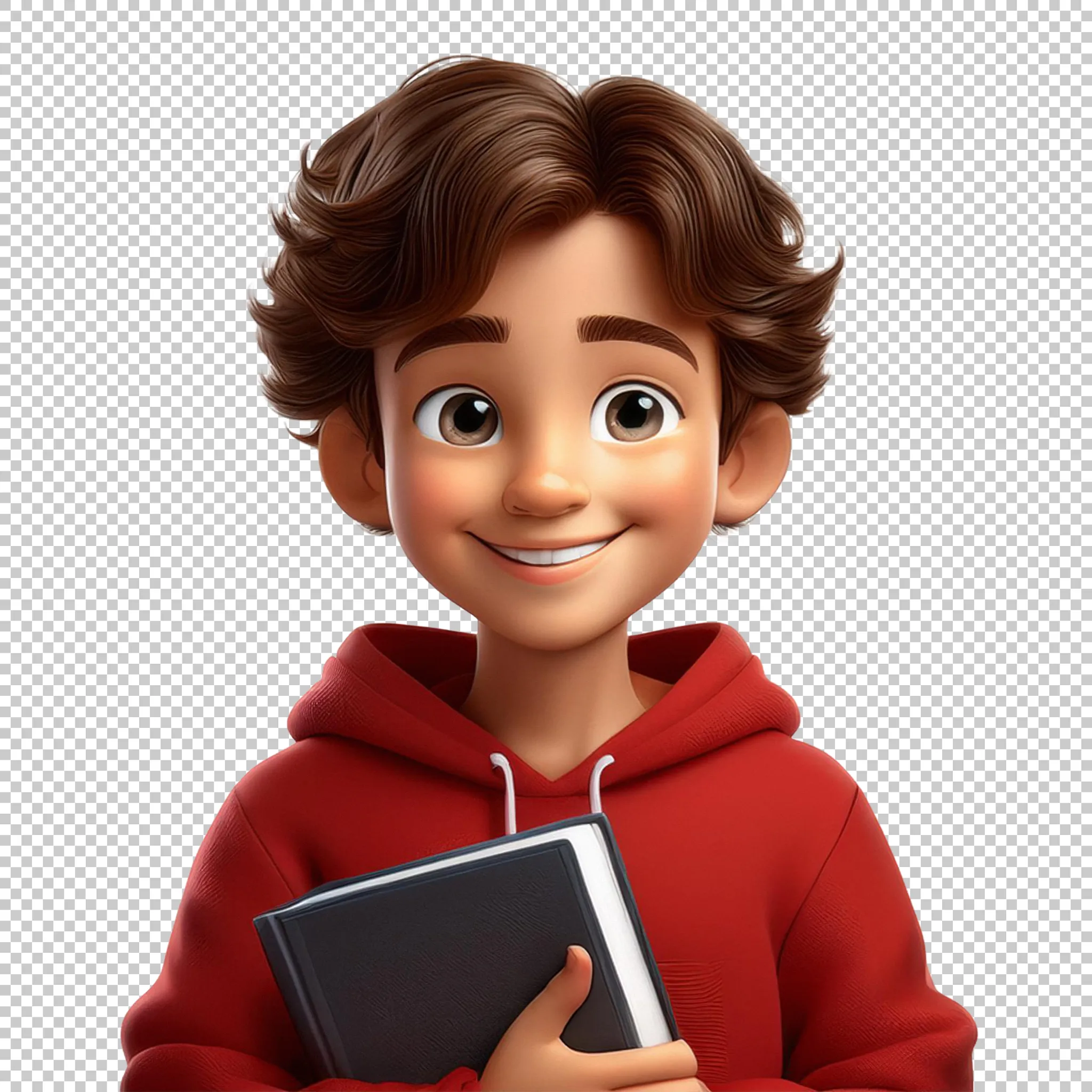 A young boy in a red hoodie carrying a school book clipped as a transparent image