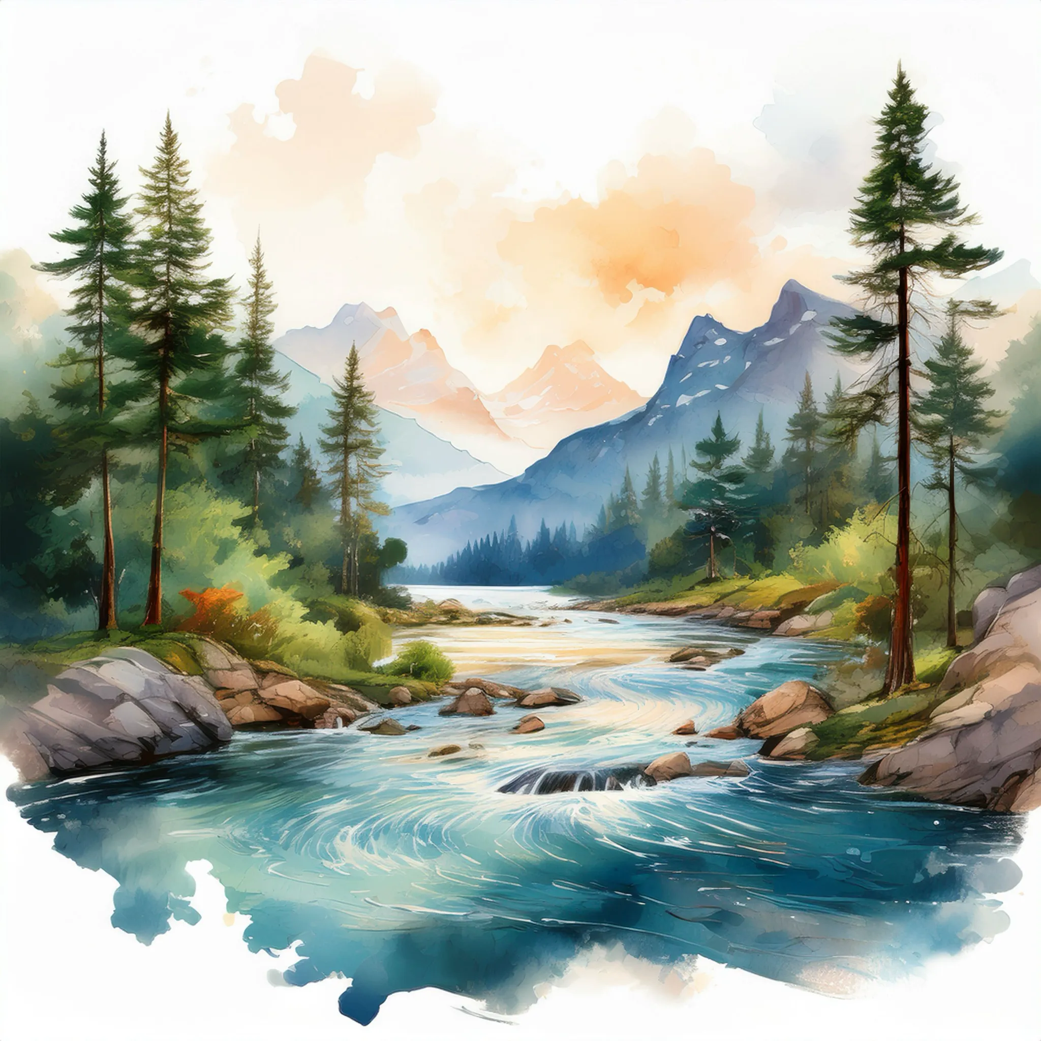 A serene watercolor painting depicts a meandering river flowing through a mountain valley at sunset, surrounded by lush evergreens and rocky banks