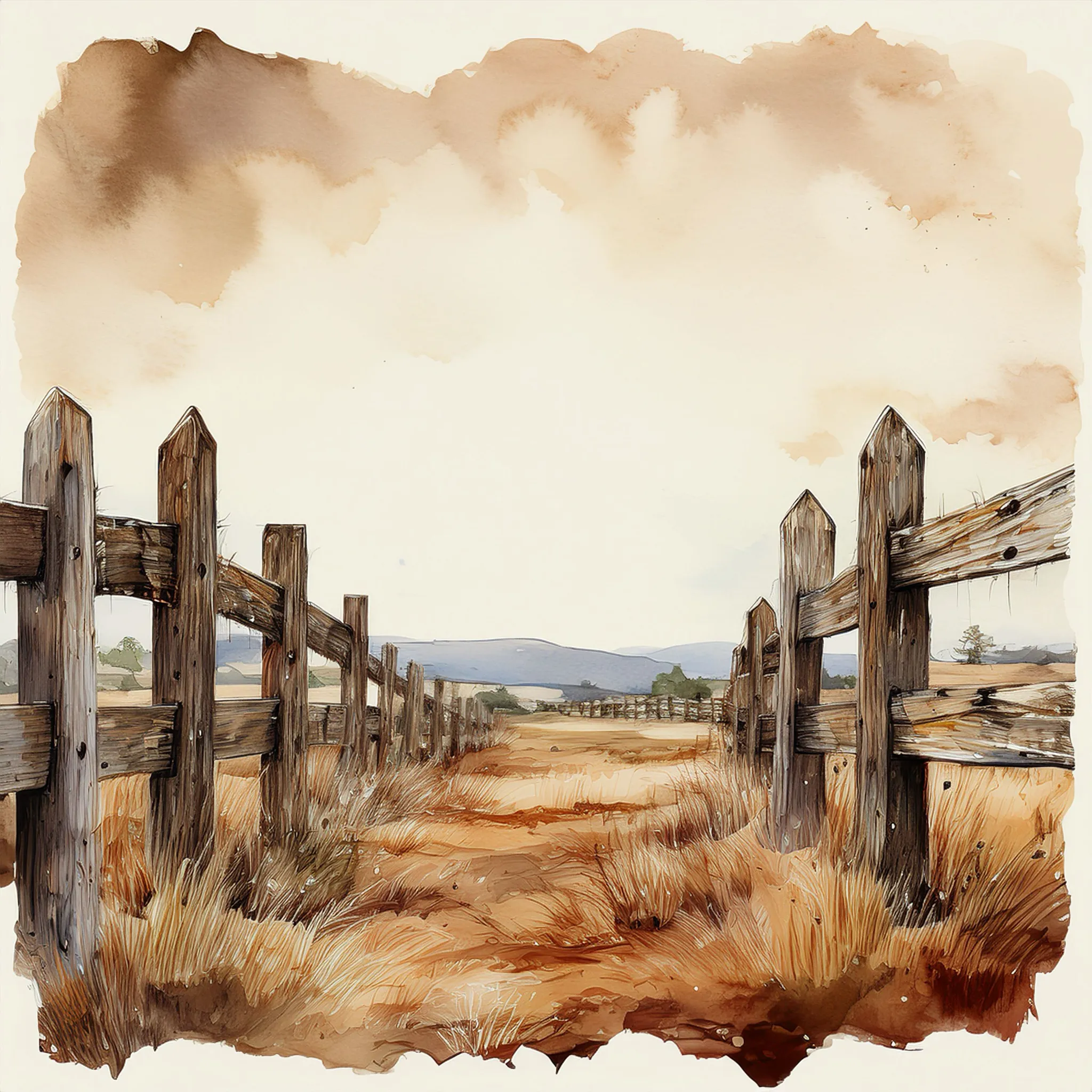 A dirt path winds through a grassy field, bordered by a weathered wooden fence with dark brown posts and horizontal planks with copy space