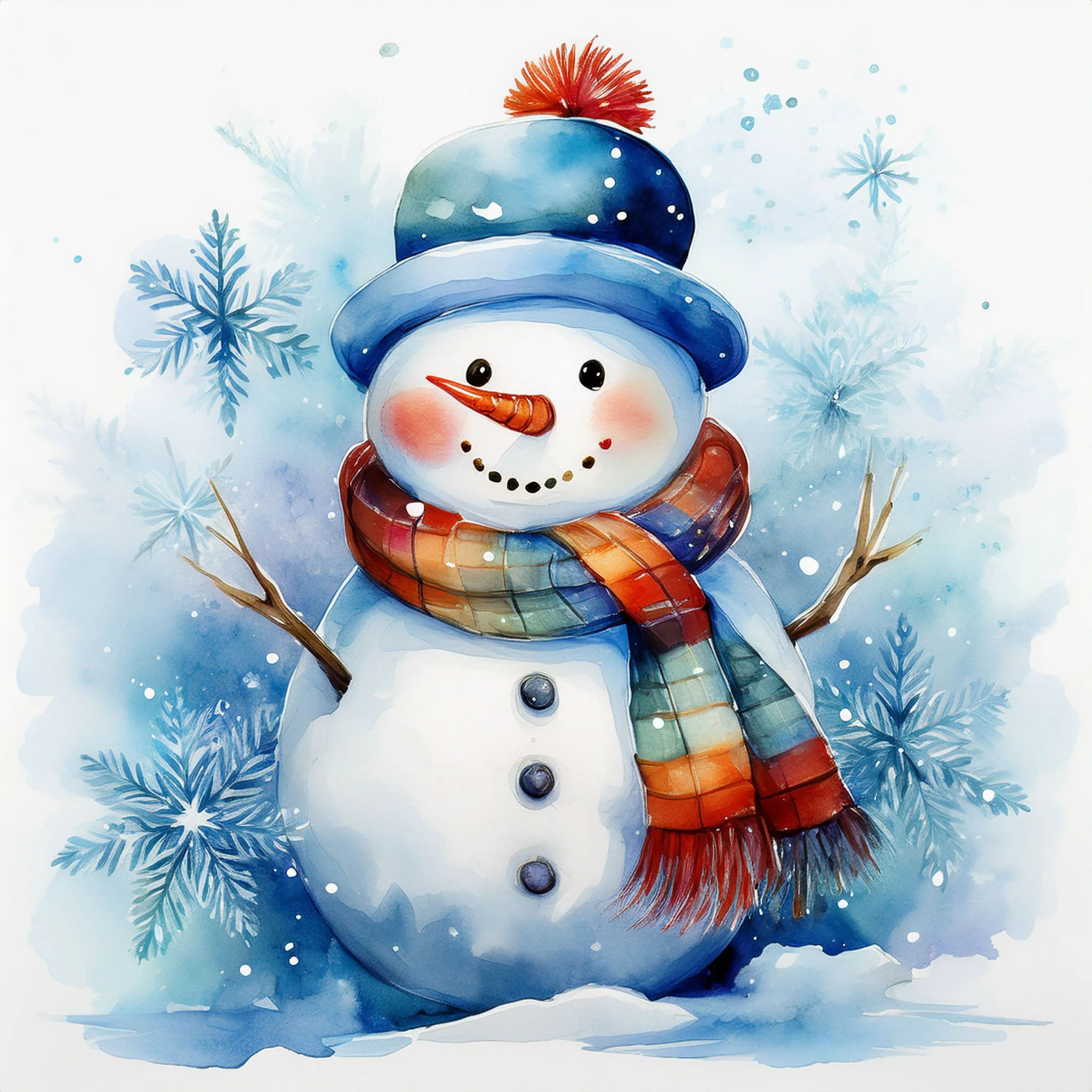 A painting of a cute snowman against stylized pine branches and delicate spots of watercolor paint that create a snowy background.