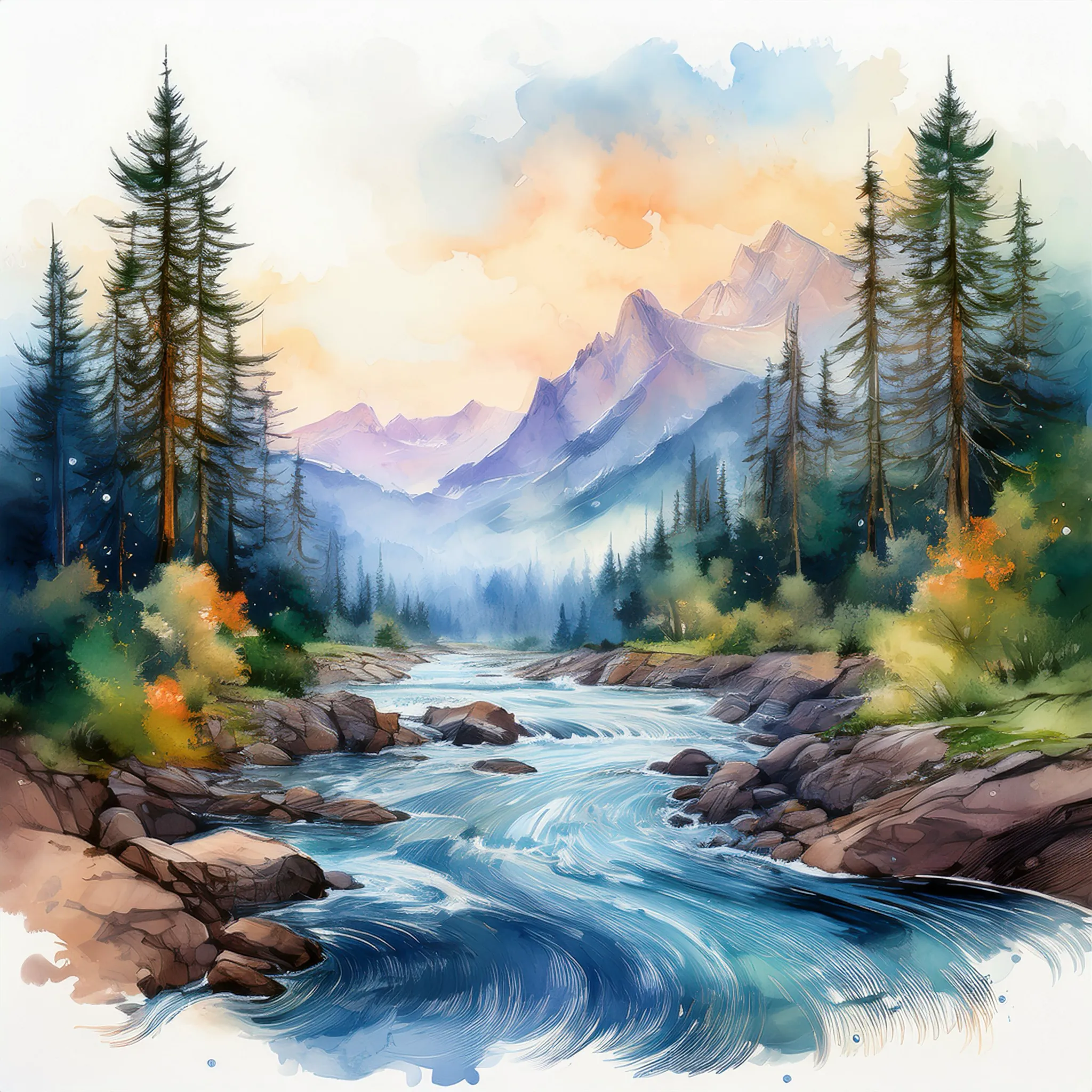 A serene watercolor painting depicts a meandering river flowing through a mountain valley at sunset, surrounded by lush evergreens and rocky banks