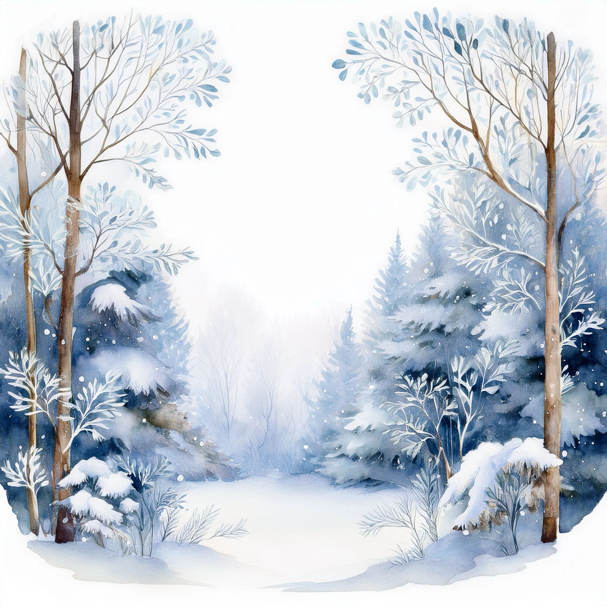 A winter forest scene of snow. Small, frosted bushes and branches are scattered across the snow with copy space.