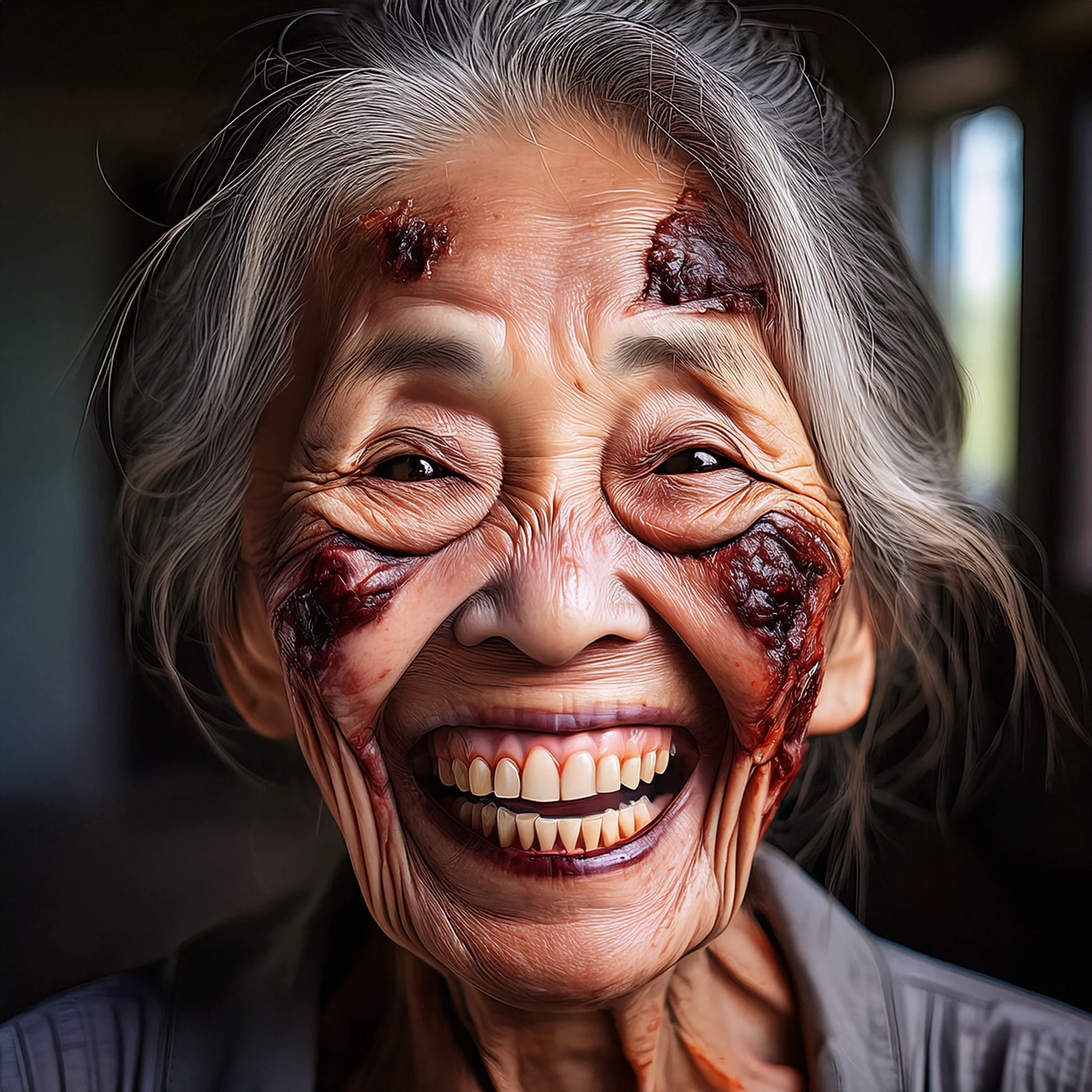 A smiling old asian female zombie laughing
