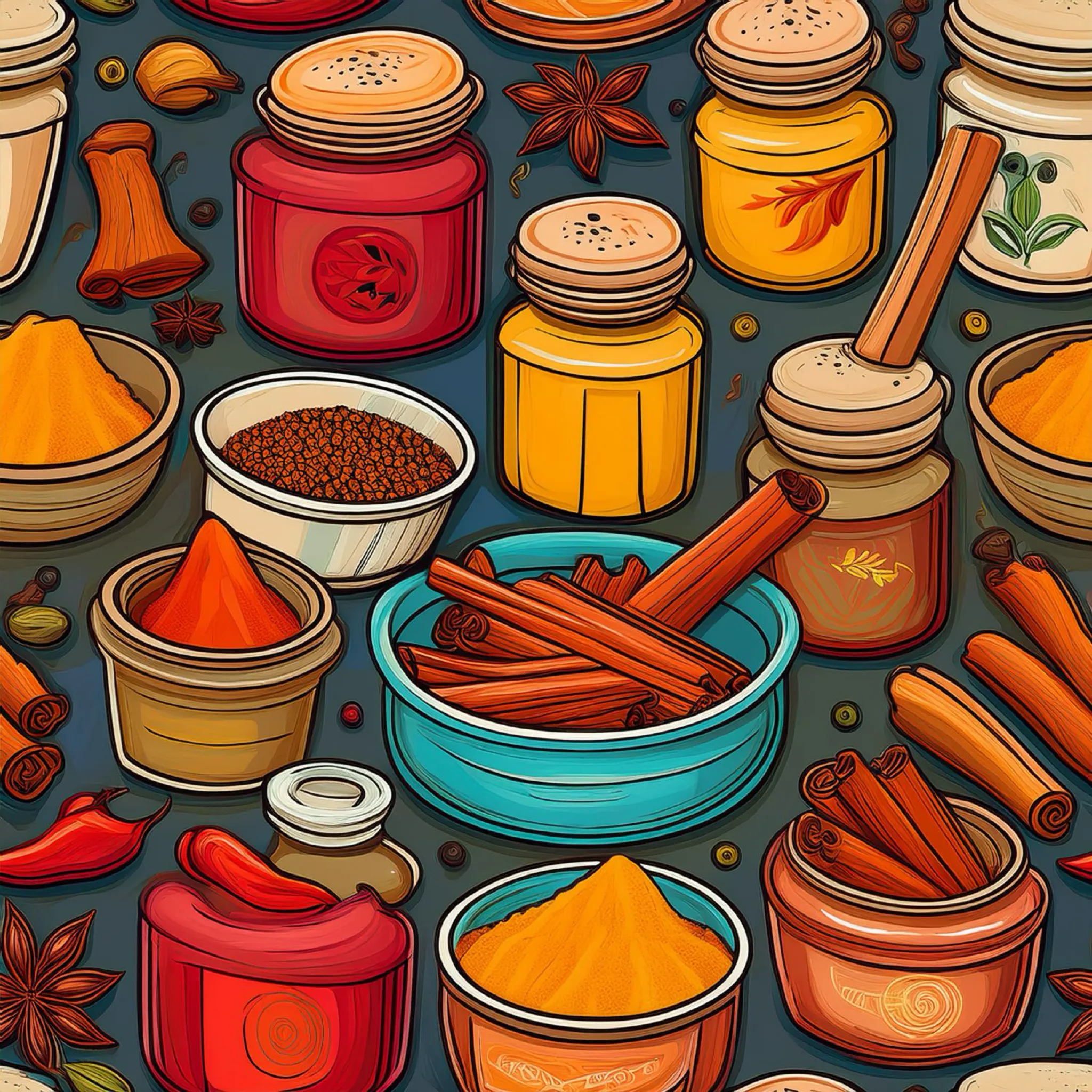 A collage of spices in various containers as a seamless tile